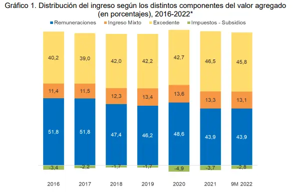 La Facultad Latinoamericana de Ciencias Sociales (FLACSO) elaboró un informe que repasa la situación del ingreso en Argentina. Del mismo se desprende que como resultado de la reducción en la participación de los asalariados en el ingreso, se advierte un incremento en la apropiación del excedente empresario, que va del 40,2% del valor agregado en 2016 al 42,2% en 2019, para luego elevarse al 45,8% en 2022.