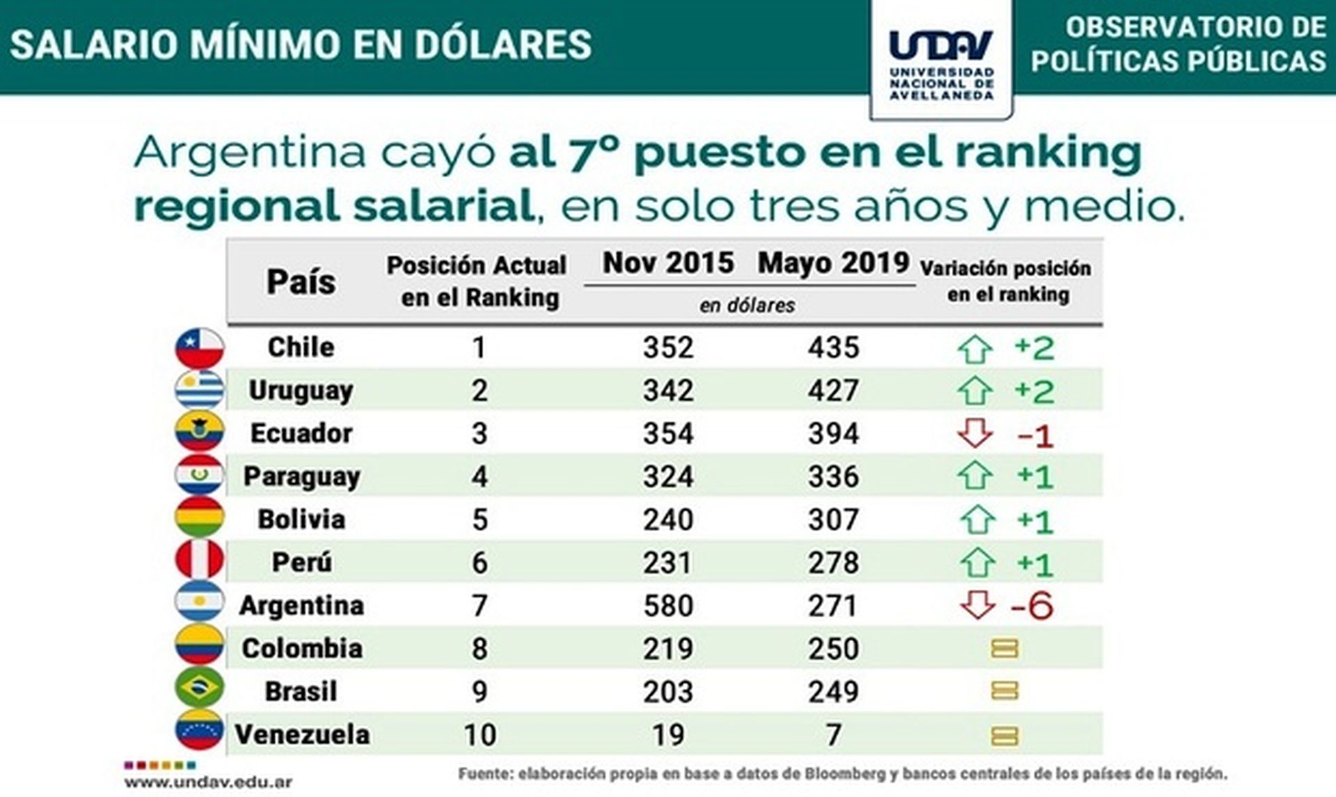 De acuerdo con un estudio del Observatorio de Políticas Públicas de la Universidad Nacional de Avellaneda (UNDAV), revela que, en los últimos 3 años y medio, Argentina pasó de tener el mejor salario mínimo de la región a ocupar el séptimo puesto. Medido en dólares se redujo a más de la mitad.