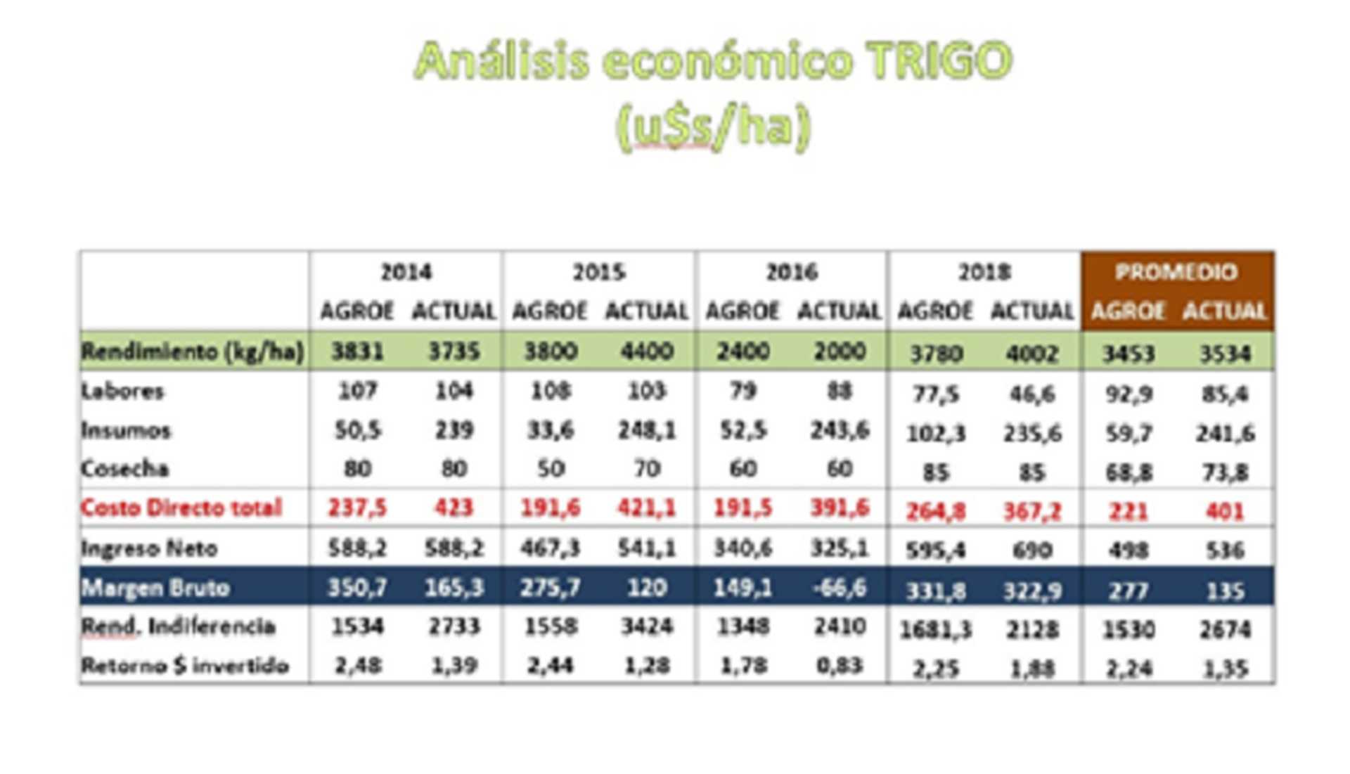 En el caso del trigo, comparando el promedio de las cuatro últimas cosechas, el módulo agroecológico rindió 3.452 kilos/hectárea contra 3,.534 kilos del módulo convencional. Pero mientras en el primero el costo de producción fue de 221 dólares por hectárea, en el modelo actual el costo trepaba a 401 dólares. El gran ahorro se registra en el renglón “insumos” que cae casi 190 dólares por hectárea. Es ese luego el factor que permite entender el salto del margen bruto que deja el cultivo en uno y otro caso. En el modelo actual fue de 135 dólares. En el ecológico, de 277 dólares.