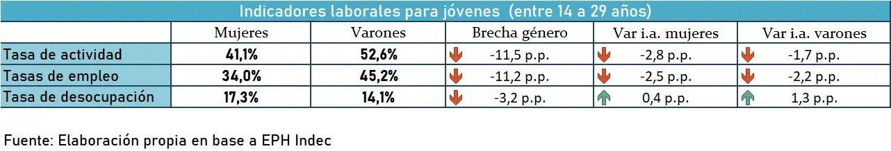 Como se evidencia a nivel global, pese a que toda la población joven tiene una tasa de actividad y empleo menor a la general, al abrir por sexo se observa que los varones jóvenes registran, una tasa superior a la del total de mujeres. Así la brecha laboral por género en el nivel de actividad de la juventud es de 11,5 puntos a favor de los varones y en el caso del empleo ellos las superan en 11,2 puntos. En contraste, las mujeres encabezan el porcentaje de desempleo juvenil estando 3,2 puntos por arriba, según los datos oficiales difundidos.