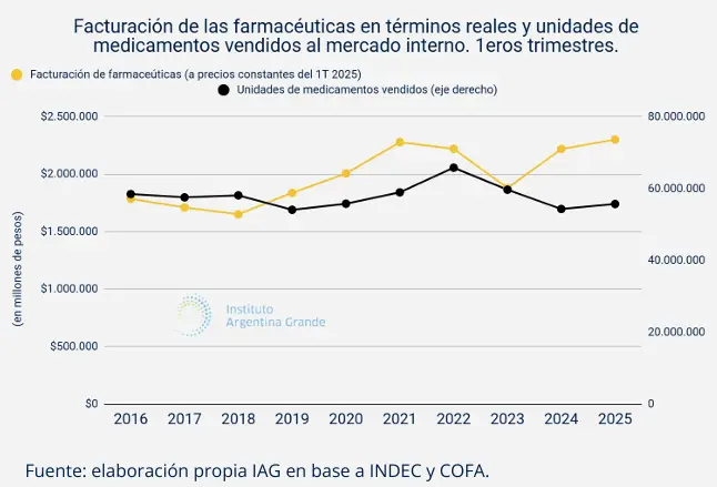En tal esquema mientras la facturación de las farmacéuticas alcanzó su pico desde la serie actual del Indec (2016) el consumo de medicamentos prácticamente no aumentó: “desde el cambio de gestión las dos curvas -facturación de las farmacéuticas y consumo de medicamentos- se desvinculan: el aumento de la facturación no responde a un aumento de los medicamentos consumidos”, explicaron desde el Instituto Argentina Grande (IAG).