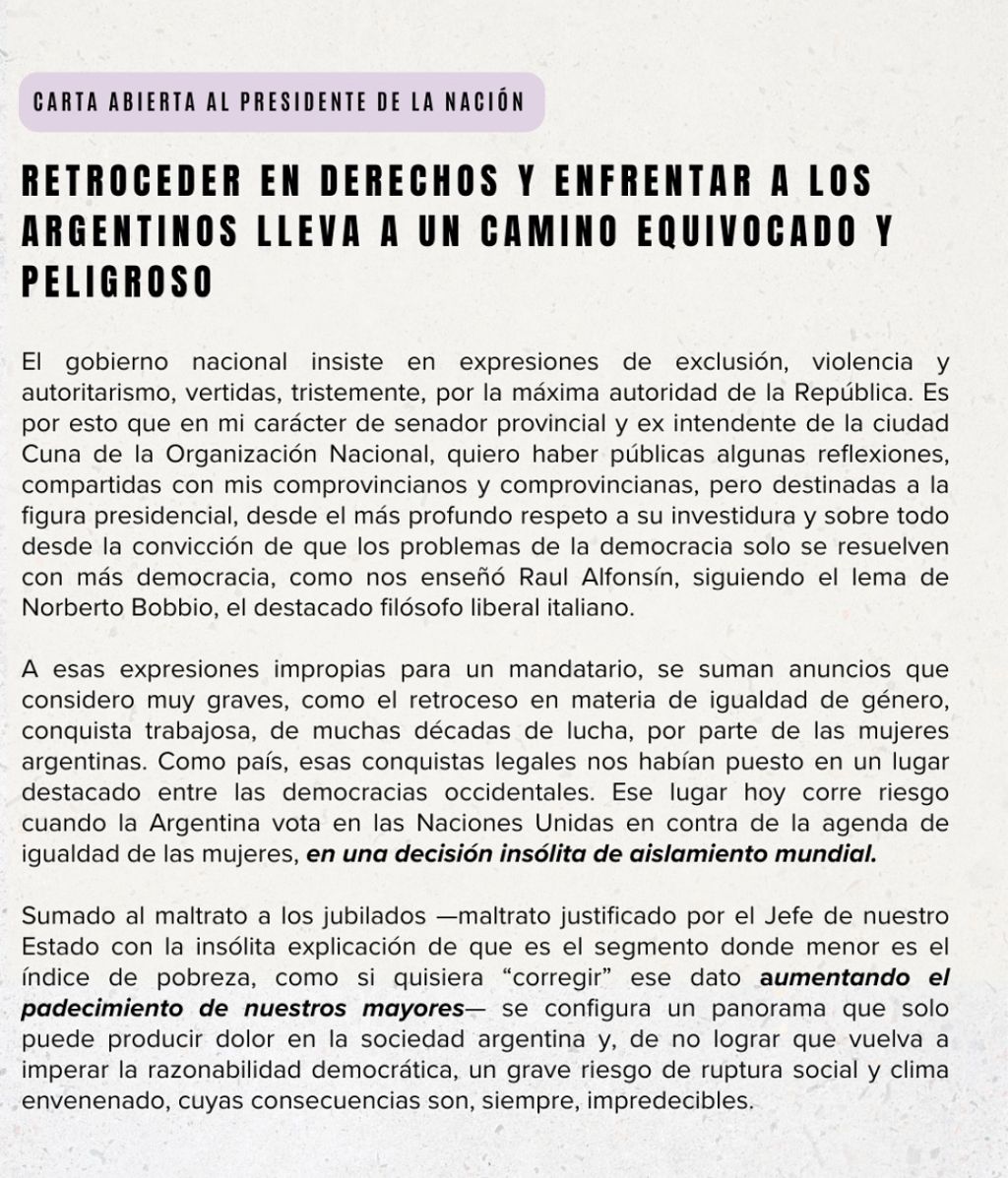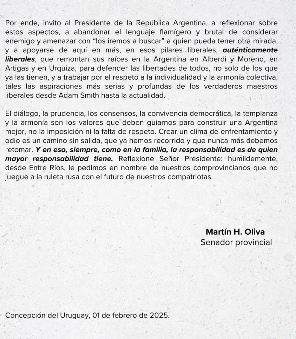 El ex intendente de Concepción del Uruguay y actual Senador provincial por el departamento Uruguay, Dr. Martín Oliva; acaba de publicar en las redes sociales esta Carta Abierta dirigida al Presidente de la Nación, que ponemos a disposición de los lectores de La Ciudad: