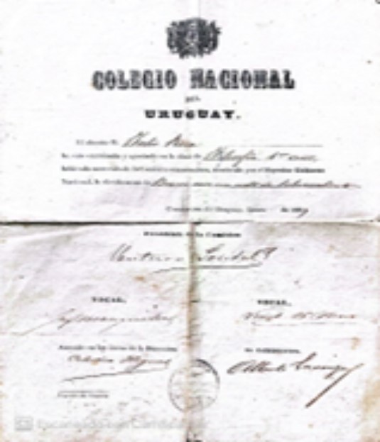 Documento Nro. 2: Acta de examen del año 1859, del alumno Julio Roca (polémico líder de la generación del ’80 y dos veces Presidente de la Nación 1880 -1886 y 1898- 1904) Rendía Filosofía de primer año y su nota fue Bueno con un voto Sobresaliente. Figuran los integrantes del tribunal evaluador presidido por Ventura Pondal y el catedrático era Alberto Larroque. El documento fue emitido por la Imprenta del Colegio.
