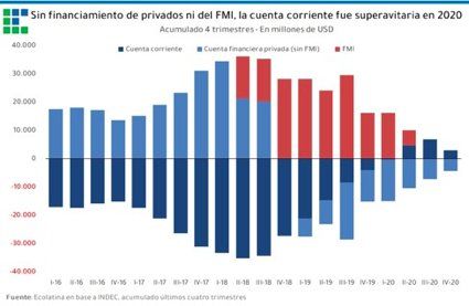 «El prolongado déficit de la cuenta corriente comenzó a encontrar su fin en 2018, cuando los inversores externos dejaron de querer financiarlo. A medida que los capitales privados revertían su ciclo y huían del país, el tipo de cambio se encarecía, sumiendo a nuestra economía en una aguda crisis. El cierre de la cuenta corriente no fue completo ese año, y el FMI fue quien aportó los dólares con los que se pagaron las importaciones, intereses y el saldo de servicios. En 2019, esto se repitió, acompañado de una importante pérdida de Reservas del Banco Central (u$s-21.000 millones)» completó el análisis Ecolatina.