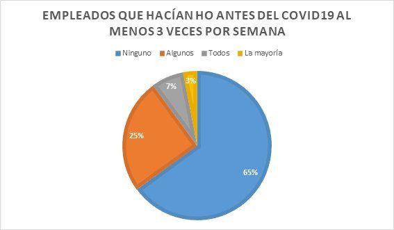 Ante la pregunta sobre qué cantidad de empleados realizaban “home office” al menos 3 veces semanales antes del brote de COVID19, el 65% de los encuestados indicó que ninguno de sus empleados lo hacía, el 25% indicó algunos, el 7% todos y el 3% la mayoría. Hoy, de ese 65%, un 42% tiene a más de la mitad de la nómica trabajando de manera remota. “Muchas veces los factores externos fuerzan cambios profundos. Tanto en personas como en organizaciones”, dice Irigoin.