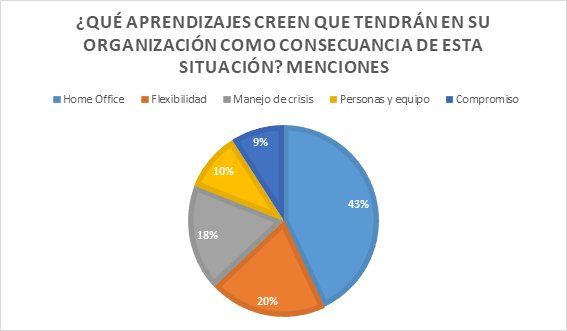 El 43% de los directores de RRHH encuestados consideró que el mayor aprendizaje que tendrán en su organización como consecuencia del COVID-19 estará relacionado con el teletrabajo, el 20% cree que el segundo aprendizaje que tendrán sus organizaciones se vincula a la necesidad de ser más agiles, innovadores, creativos y flexibles para enfrentar situaciones nuevas. Y, el tercer mayor aprendizaje, señalado por el 18% creen que se dará en relación al manejo de crisis.
