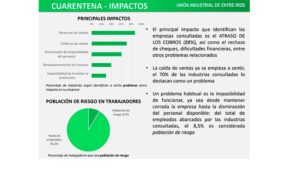 El Área de Monitoreo Industrial de la Unión Industrial de Entre Ríos (UIER) elaboró un nuevo Informe de Coyuntura para el primer trimestre de 2020. Allí se advierte por el escenario crítico que atraviesa la mayoría de los establecimientos, con caídas en los niveles de producción y ventas que se agravaron aún más a partir de la cuarentena obligatoria que dispuso el Gobierno nacional para morigerar el avance del coronavirus.De acuerdo a las consultas realizadas a las empresas productivas de todo el territorio provincial, el 88% identificó que el principal impacto que sufren es el atraso de los cobros, lo que se suma al rechazo de cheques, dificultades financieras, entre otros problemas relacionados. Del mismo modo, la caída de ventas ya se empieza a sentir, por lo que el 70% de las industrias consultadas lo destacan como un problema importante.Si bien existen empresas de la provincia que continúan trabajando con todas las medidas de seguridad e higiene exigidas por los organismos sanitarios, por otro lado las industrias advierten por la imposibilidad de funcionar, ya sea desde mantener cerrada la planta hasta la disminución del personal disponible, en un 60%. Respecto de este punto, el informe precisa que del total de empleados abarcados, el 8,5% es considerado población de riesgo.Asimismo, en relación a las medidas implementadas ante la pandemia, el 59% respondió que realizan teletrabajo o home office, el 41% redujo los grupos de trabajo y llevó a otras alternativas para reducir la aglomeración del personal de las plantas. Todo ello, además, se complementó con charlas y capacitaciones a los trabajadores, para restringir el intercambio de elementos de trabajo, entre otras situaciones. De igual modo, muchas empresas también debieron cerrar sus plantas temporalmente e incluso adelantar vacaciones.