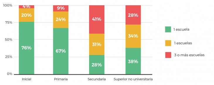 – En el nivel primario, uno de cada tres docentes trabaja en más de una escuela. En el nivel secundario, 7 de cada 10 docentes trabajan en más de una escuela.