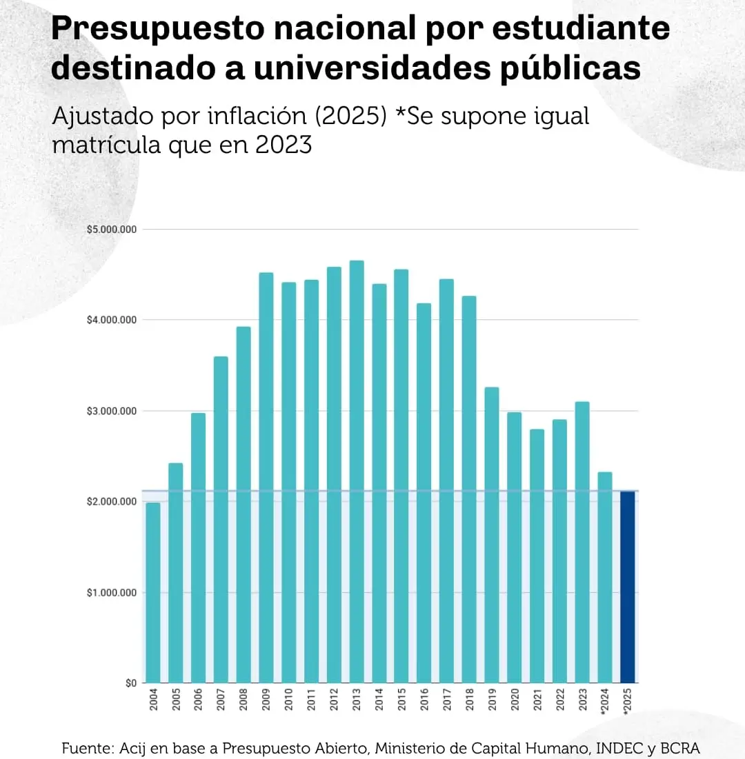 Si se compara desde el año 2023, el presupuesto universitario acumula una caída del 32%, un recorte que compromete el funcionamiento de las casas de estudio y limita su capacidad para garantizar el acceso a una educación superior gratuita y de calidad. En este escenario, la inversión por estudiante es la más baja desde 2005. “Es de $2,1 millones en 2025 cuando, en promedio, entre 2010 y 2023 se gastaba $4 millones, y ajustada por inflación, esta cifra es 53% menor que la registrada hace una década”, señaló un documento presentado por la Asociación Civil por la Igualdad y la Justicia (ACIJ).