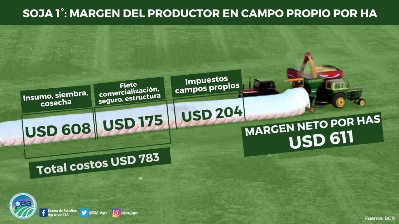 El que invierte en un campo propio obtiene un Margen Neto de USD 611 por Ha, luego de descontar al IB: USD 375 de insumos; USD 97 de siembra y pulverización; USD 136 cosecha; USD 58 de flete; USD 33 de seguro; USD 60 de comercialización; USD 24 de estructura; y USD 204 de impuestos a campo propio.