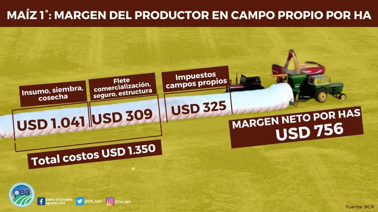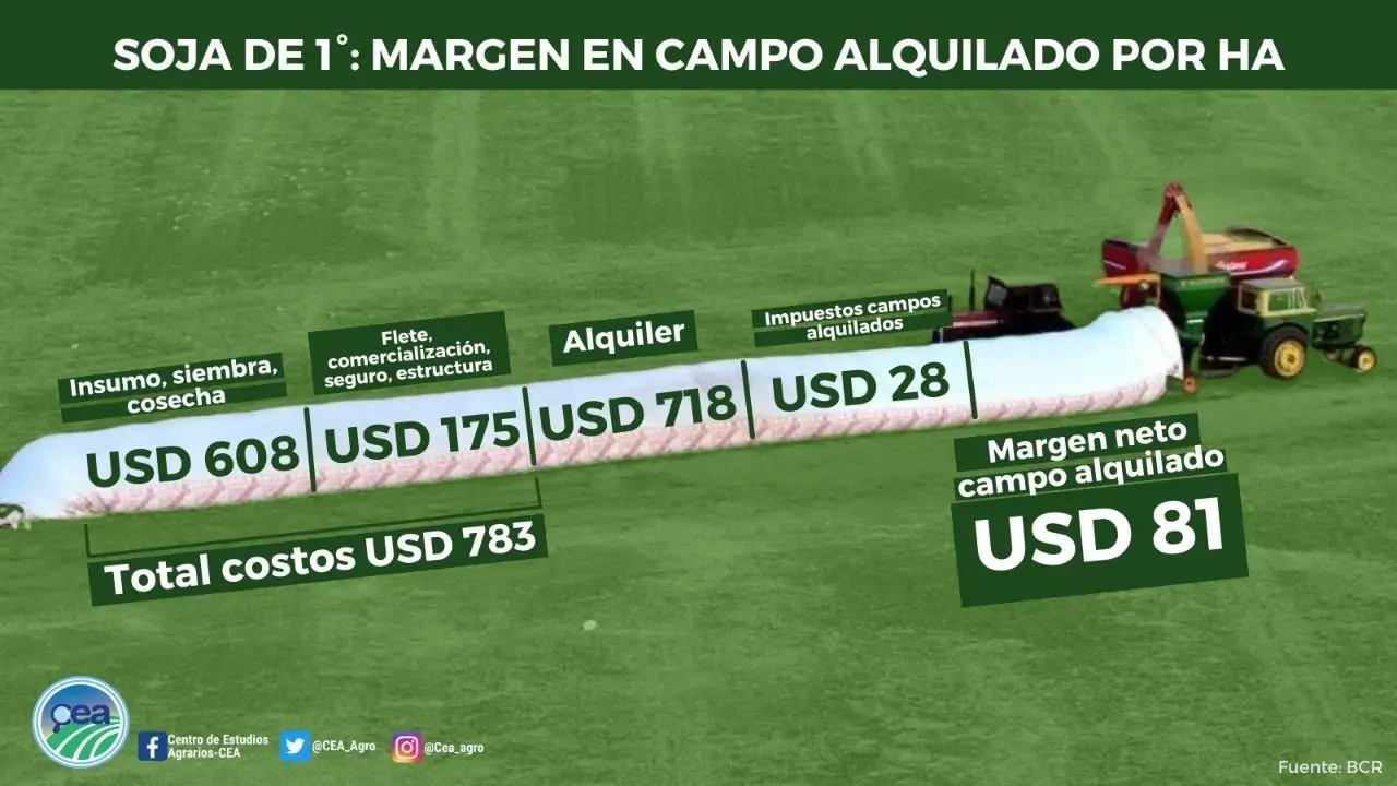 El informe plantea que para “hacer soja se requiere una inversión de 783 u$s/ha; hacer maíz, 1.349 u$s/ha”, es decir que para Soja de 1° en campo propio, por cada dólar invertido el retorno es de USD 0,78; mientras que para el Maíz de 1° en campo propio por cada dólar invertido se obtiene USD 0,56. Mientras que el retorno para Soja de 1° en campo alquilado es de USD 81 tras invertir USD 783, es decir USD 0,10 por cada dólar invertido. Mientras que para el Maíz de 1° en campo alquilado obtiene USD 256 tras invertir USD 1.349, es decir USD 0,19 por cada dólar invertido, casi el doble respecto a la soja.