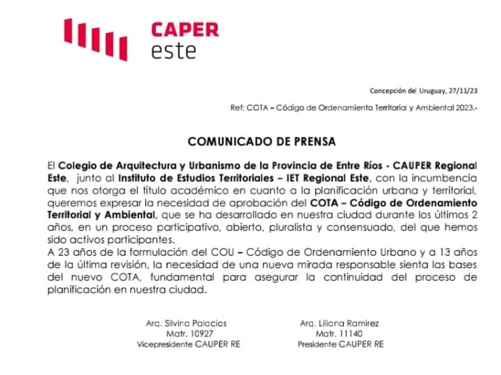 El Colegio de Arquitectura y Urbanismo de la Provincia de Entre Ríos – Cauper Regional Este, junto al Instituto de Estudios Territoriales – IET Regional Este, con la incumbencia que nos otorga el título académico en cuanto a la planificación urbana y territorial, queremos expresar la necesidad de aprobación del COTA – Código de Ordenamiento Territorial y Ambiental, que se ha desarrollado en nuestra ciudad durante los últimos 2 años, en un proceso participativo, abierto, pluralista y consensuado, del que hemos sido activos participantes.