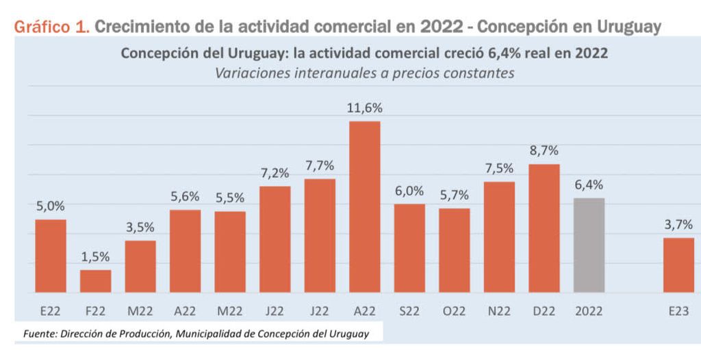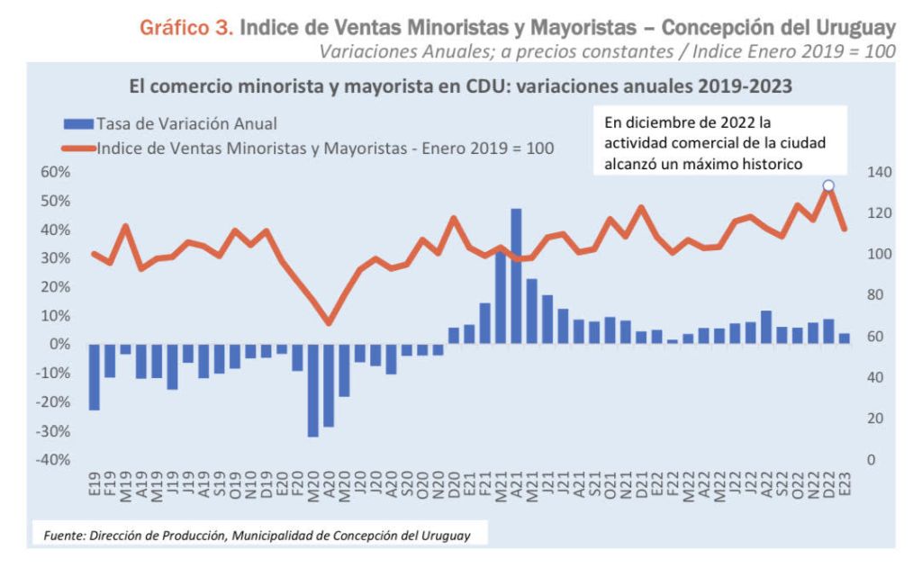 La actividad comercial de la ciudad finalizó 2022 con un crecimiento de 6,4%//Las ventas, medidas a precios reales, fueron además 9,5% superiores a 2019 (pre- pandemia)//Enero de 2023 comenzó más tranquilo, pero en alza, mejorando 3,7% frente al mismo mes del año pasado y 16,5% frente a enero 2020 // Comparado con diciembre, en enero se vendió 15,8% menos, pero se explica por la estacionalidad del sector: diciembre es el mejor mes del año // “Productos textiles, calzados y cueros” fue el rubro de mayor crecimiento en 2022 (+19,2%) aunque en parte se explica porque en 2021 esa actividad aún no se había recuperado de la pandemia //