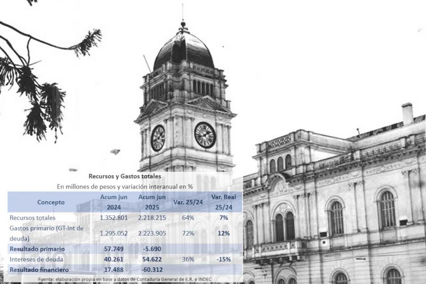 Hacia el mes de junio del año 2025, el resultado primario del Estado Provincial fue deficitario en -$5,7 mil millones. Si se incluye el pago de intereses de deuda que llega a $54 mil millones, el resultado financiero–es decir, la diferencia entre el total de ingresos y total de egresos– es negativo en -$60 mil millones. Tomando los datos de inflación mensual y llevando a precios de junio 2025, podemos establecer que los recursos totales crecieron un 7%, así como gastos primarios aumentaron un 12%, superando la inflación del período. La inflación acumulada a junio de 2025, fue de 15,1% y la interanual de un 39,4%Recursos públicos provinciales