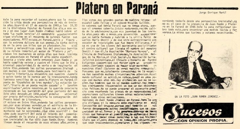 El poeta Jorge Enrique Martí en una crónica destacó que “vale la pena recordar el suceso, ahora que la evocación lo sitúa desde una perspectiva de más de treinta años. Ocurrió el 28 de agosto de 1948, a las 18,30 en la Biblioteca Popular de Paraná. Ese día, a esa hora y en ese lugar Juan Ramón Jiménez habló sobre el tema La razón heroica. El memorable acontecimiento sigue vivísimo en el recuerdo de quienes fueron sus espectadores. Allí estaba, en Paraná, genio y figura, con la extrema dulzura de sus poemas, la barba estirada en la pera con hilos que ya plateaban los ojos tiernos y melancólicos como los del precioso burrito de su relato inmortal, el autor de Platero y yo. ¿Saben los muchachos de estos días que hace treinta y un años estuvo en Paraná el alto poeta español? Sesenta y siete años tenía entonces Juan Ramón y ya había cumplido veinte y cuatro el libro que le dio universal popularidad. Es de verlo o de imaginarlo en Entre Ríos, andando las calles paranaenses. Dialogó, con muchos o con todos. Queda para testimonio de la historia literaria su encuentro con nuestro Juanele a quien tanto se le parece por la transparente, honda luminosa sencillez de su poesía.”