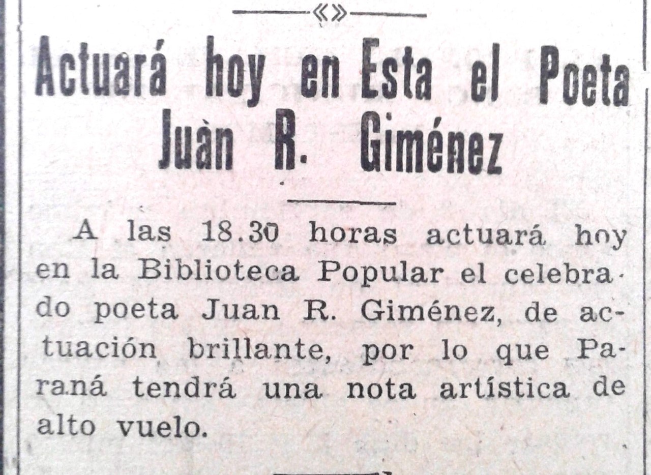El diario La Acción anunciaba brevemente que “a las 18,30 horas actuará hoy en la Biblioteca Popular el celebrado poeta Juan R. Giménez (sic), de actuación brillante, por lo que Paraná tendrá una nota artística de alto vuelo.”