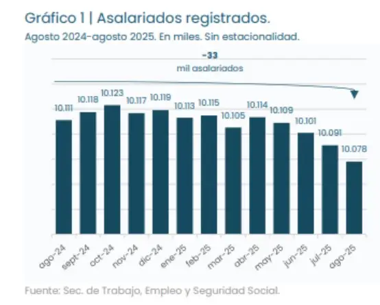 El informe arrojó que, tras un ciclo de caídas entre septiembre de 2023 y agosto de 2024, seguido por oscilaciones leves hasta abril de 2025, el mercado laboral volvió a profundizar su deterioro. Entre mayo y agosto de 2025, el empleo asalariado formal acumuló cuatro meses de descensos consecutivos, configurando una tendencia claramente regresiva.