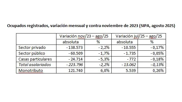 En agosto perdieron su puesto 10.555 trabajadores del sector privado, 1.735 del sector público y 772 de casas particulares. Contra noviembre de 2023, la caída ya está en los máximos para las tres categorías, según el investigador del Instituto de Estudios y Formación de la CTA – Autónoma Luis Campos. Mientras tanto, el monotributo sigue subiendo, signo de precarización del trabajo.