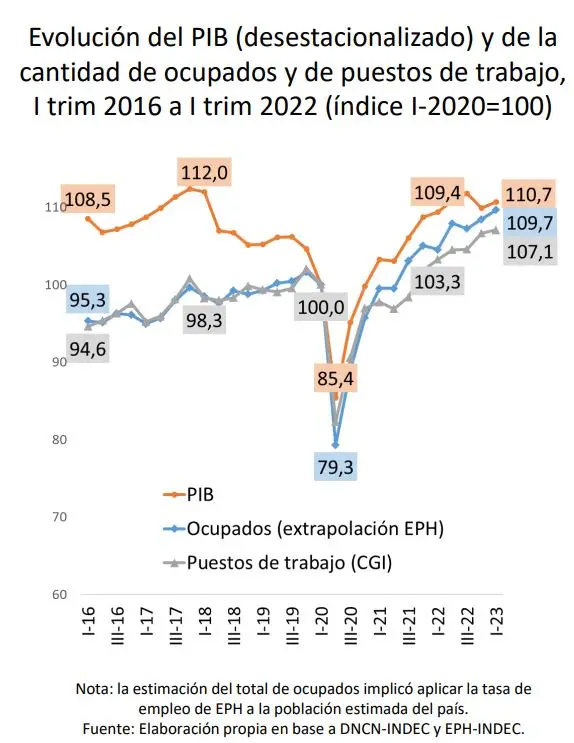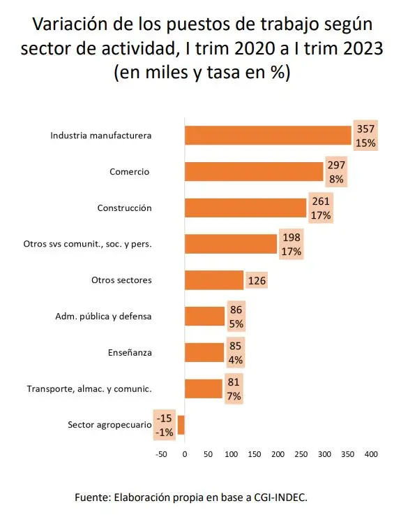 Pese a que la actividad económica registra signos de caída desde marzo, el empleo registrado muestra una continuidad en el proceso de expansión del empleo que caracterizó a todo el período de recuperación posterior a la pandemia de Covid-19. “Entre los primeros trimestres de 2020 y de 2023 se generaron en términos netos 1,5 millones de puestos de trabajo, de los cuales el 37,7 por ciento son asalariados registrados, mientras que el 39,2 por ciento son asalariados no registrados y el 23,1 por ciento son no asalariados. La industria fue el sector que más empleo generó: con 357.300 puestos netos”, destaca un informe de Cifra-CTA elaborado por Mariana González y Cecilia Garriga.