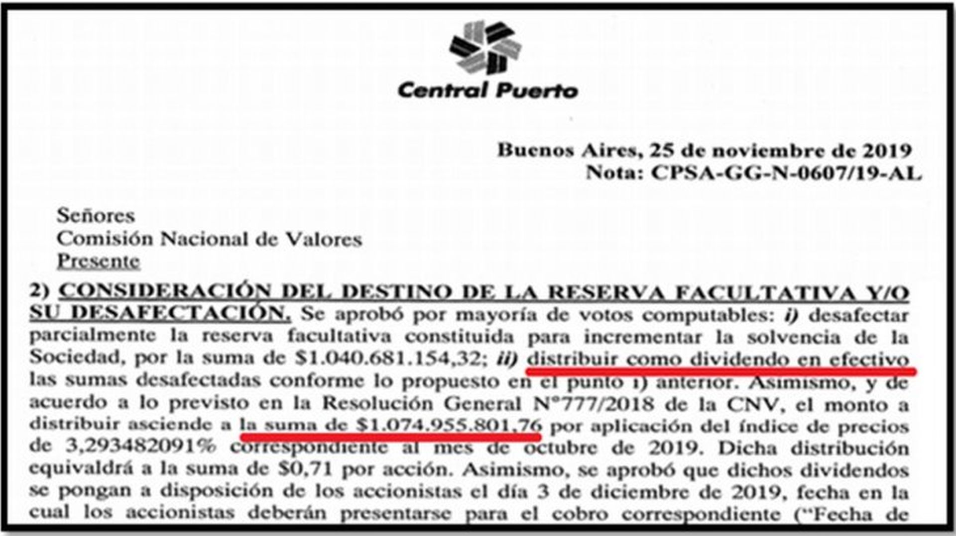 En efecto, Central Puerto, en Asamblea General Ordinaria de accionistas del 22 de noviembre de 2019, resolvió distribuir dividendos por 1.074 millones de pesos, monto que habrá de estar disponible a los accionistas a partir del 3 de diciembre.