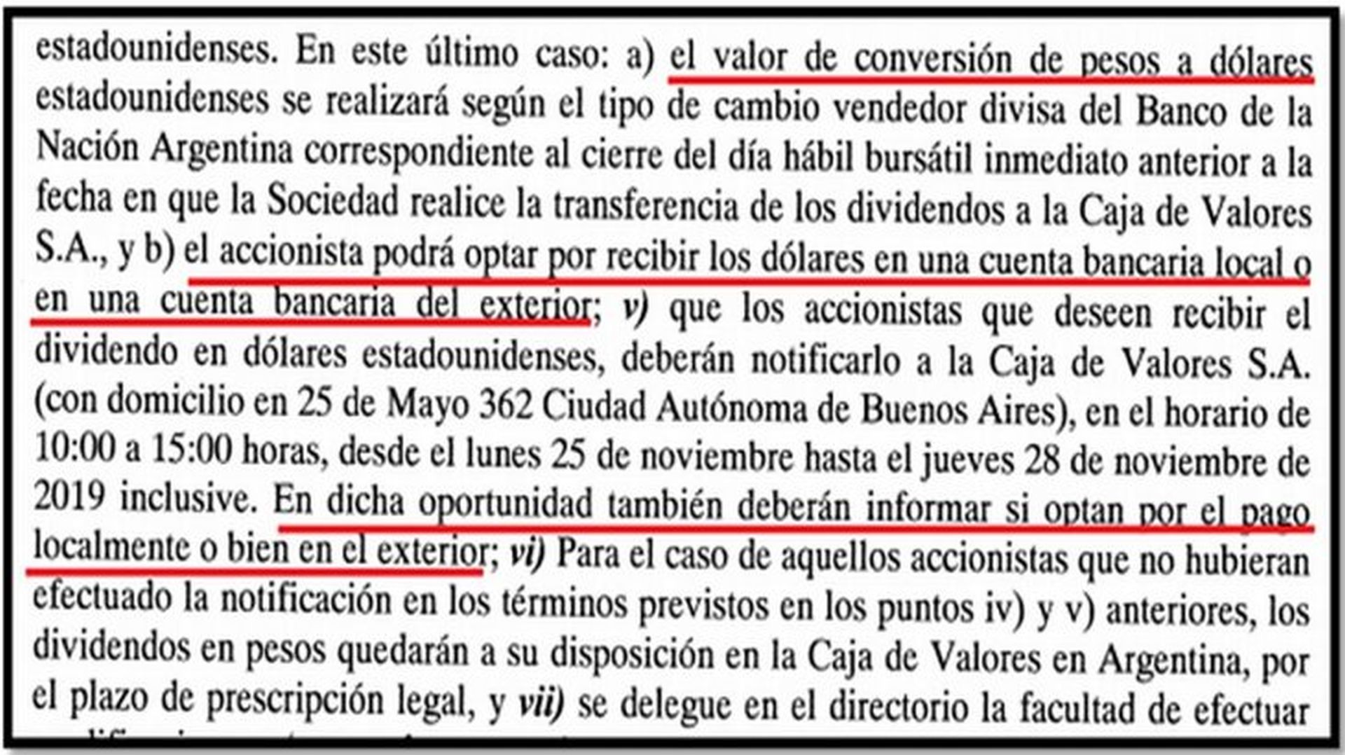 En la comunicación a la CNV del 25 de noviembre, la empresa de Caputo informó que los dividendos podrán ser pagados en dólares si sus accionistas optan por ello. Y no solamente en dólares, sino incluso depositados en una cuenta en el exterior si así lo desearan.