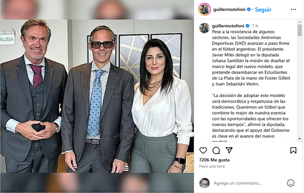 El empresario Guillermo Tofoni también mencionó a la diputada Juliana Santillán, designada por el presidente Javier Milei como la encargada de impulsar la idea de las SAD en el fútbol argentino. Según él, “La decisión de adoptar este modelo será democrática y respetuosa de las tradiciones. Queremos un fútbol que combine lo mejor de nuestra esencia con las oportunidades que ofrecen los nuevos tiempos”.