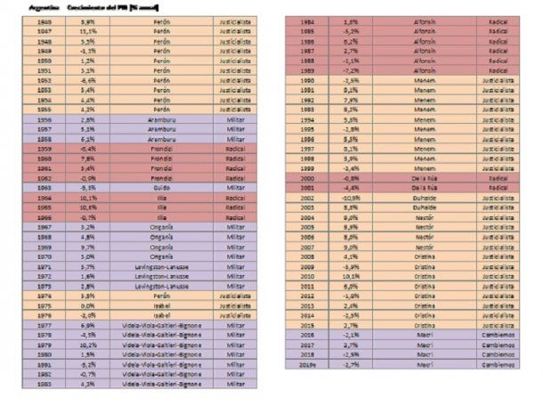 Un contundente estudio de la investigadora Daniela Köle demuestra que desde 1945 durante los 37 años de gobiernos peronistas de Perón, Cámpora, Isabelita, Menem, Duhalde, Kirchner y Cristina, el PBI real creció más que con los presidentes radicales (Frondizi, Guido, Illia, Alfonsín, De la Rúa), que con las sangrientas dictaduras (la fusiladora Revolución Libertadora, la Revolución Argentina con sus bastones largos y los genocidas ladrones de bebés del Proceso de Reorganización Nacional) y decreció con el signo Cambiemos, el que se proponía venir a hacer por primera vez en la historia algo diferente a todo lo malo que se había hecho hasta el 10 de diciembre de 2015.