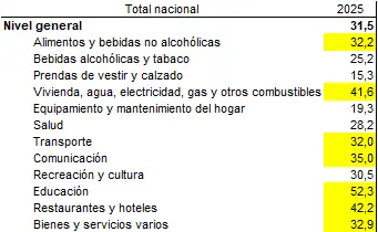 Lo anterior no es menor si se tiene en cuenta que la inflación cerró 2025 con fuertes diferencias entre los distintos componentes del índice en el marco de una fuerte reestructuración de precios relativos que encareció, sobre todo, los servicios y gastos regulados, impactando en el bolsillo de las familias y en el ingreso disponible del hogar. Así, mientras el nivel general creció 31,2% en el año, el rubro Educación se disparó 52,3%, Vivienda, servicios y combustibles (+41,6%) y puntualmente los alquileres superan el 70% de alza, el Transporte escaló 32,0%, Comunicación, (+35,0%), Restaurantes y Hoteles (+42,2%), Bienes y Servicios varios (+32,9%) y hasta los Alimentos y Bebidas se aceleraron al cierre del año y terminaron con una suba mayor promedio (+32,2%).