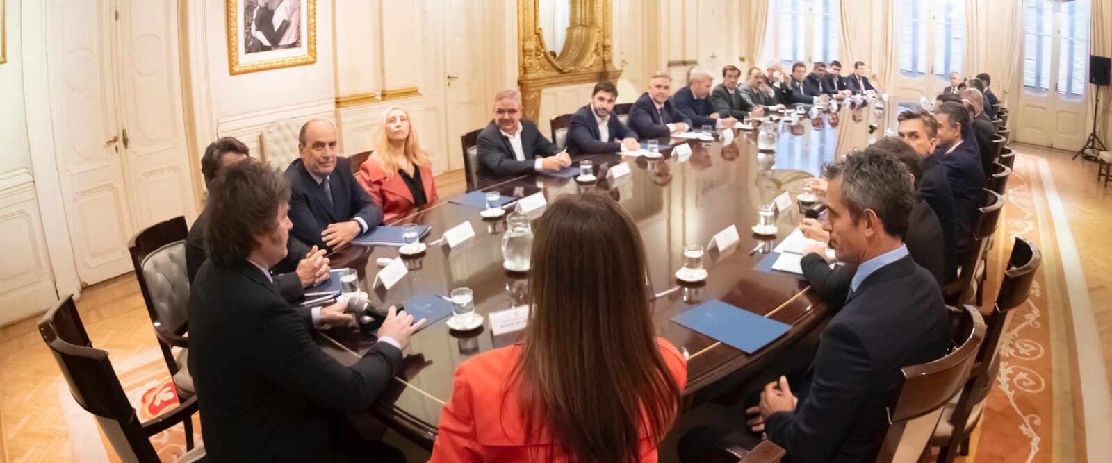 Javier Milei recibió a los gobernadores en un encuentro que duró tres horas. El Presidente estuvo acompañado por el jefe de Gabinete, Nicolás Posse; y el ministro del Interior, Guillermo Francos. Además de su hermana, Karina Milei; la vice, Victoria Villarruel; y el presidente de la Cámara de Diputados, Martín Menem.