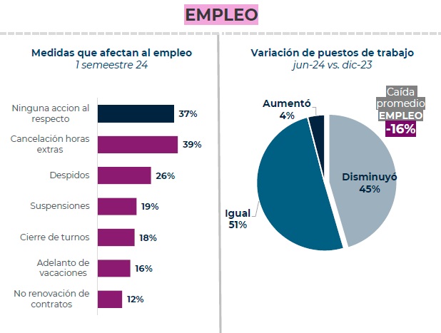 La caída en las ventas trajo como consecuencia una merma en la producción y, con ella, el despido o suspensión de trabajadores. En el primer semestre, el 63% de las empresas encuestadas por Pro Tejer debió cancelar horas extras, despedir o suspender a empleados, adelantar vacaciones o no renovar contratos. Cabe destacar que la industria textil emplea a unas 540.000 personas en todo el país.