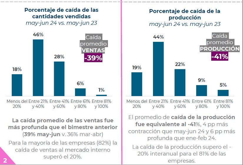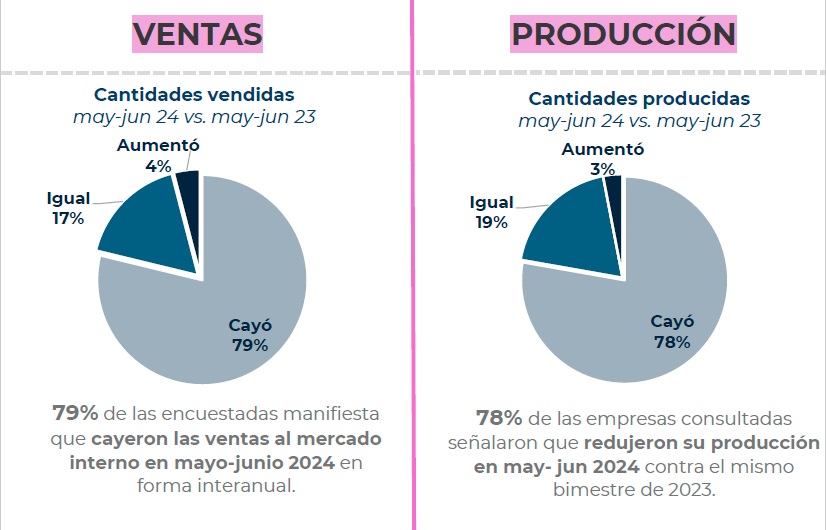 Las ventas registraron una caída promedio interanual del 39%, mientras que la producción se contrajo un 41%. El uso de la capacidad instalada, mientras tanto, cayó en el 76% de los casos relevados.