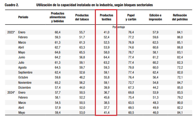 En mayo de este año, la industria textil sólo usó el 41,4% de su capacidad instalada, según datos brindados por el Instituto Nacional de Estadística y Censos (Indec). En el quinto mes del año pasado, el 58% de las máquinas y equipos instalados en estas fábricas estaba en uso.