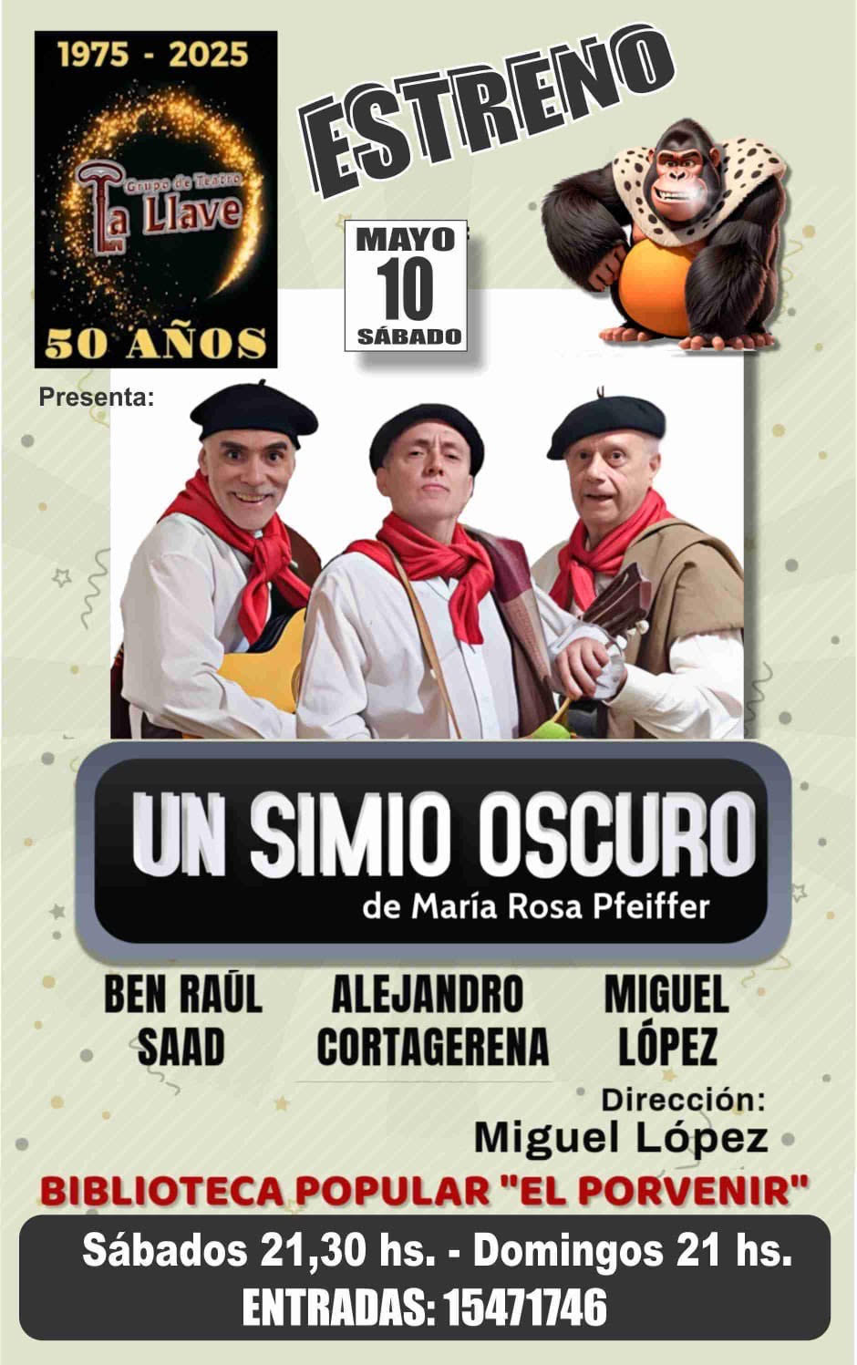Cumpliendo 50 años ininterrumpidos, el Grupo de Teatro La Llave presenta la obra de María Rosa Pfeiffer “Un simio oscuro”.