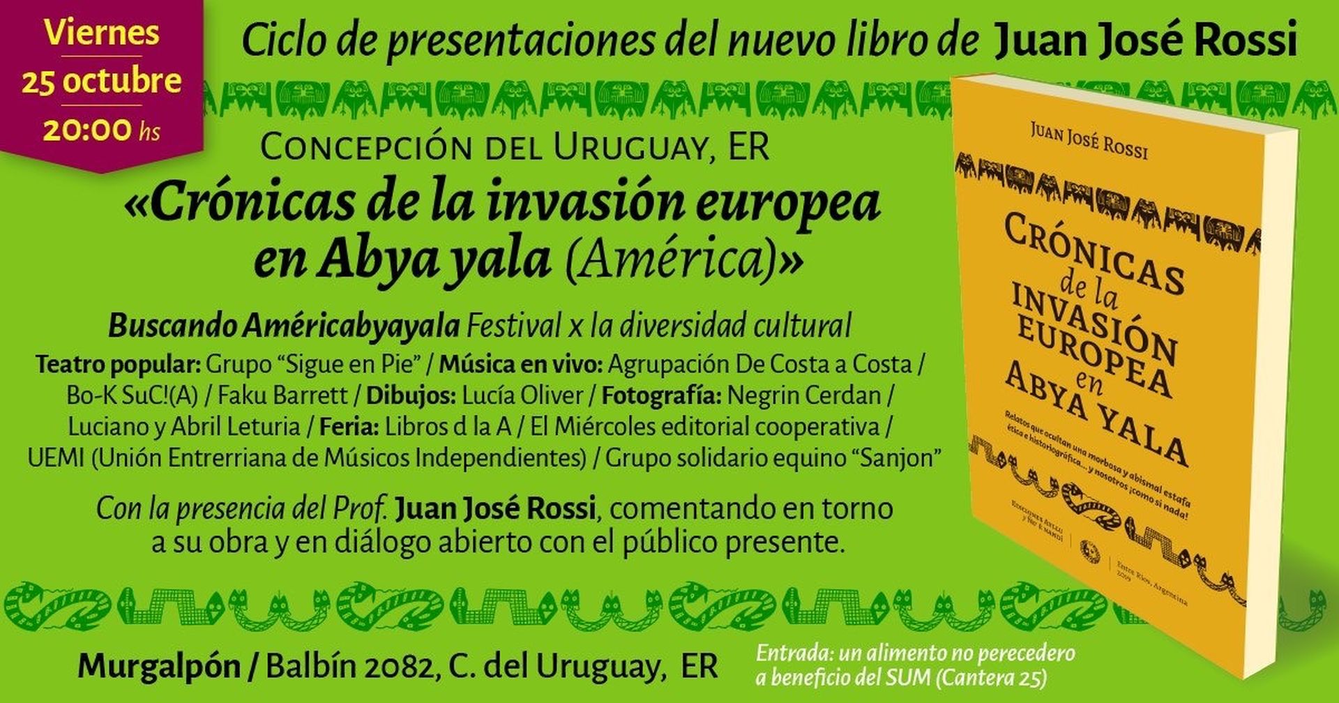Juan José Rossi presentará en nuestra ciudad su libro recién editado este viernes 25 de octubre a las 20 horas en Murgalpón de nuestra ciudad (Balbín 2082). El encuentro es abierto a todo público y la entrada consiste en un alimento no perecedero que tendrá como destino el SUM de la Cantera 25. Buena excusa para escuchar a este veterano entre los historiadores, un indignado sin atenuantes con la invasión europea en el Abya yala (América), al punto de hacer carne esa rabia.