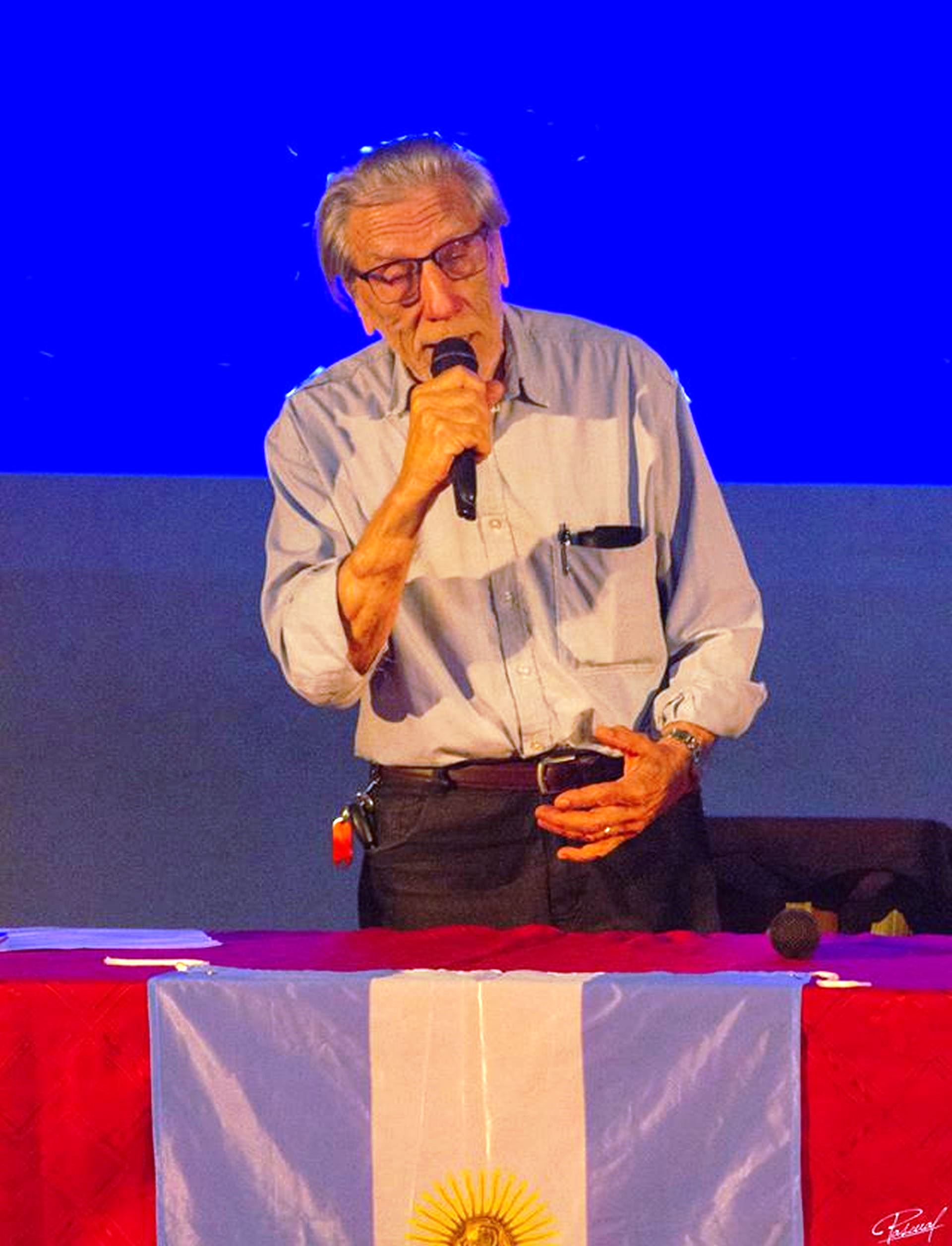 Luego se presentó al invitado dueño de una trayectoria atravesada por su pasión por la historia nacional, la militancia política, el revisionismo histórico y su generosidad en las aulas. Como militante político sufrió la prisión y el exilio, además abogado, historiador y docente de casas en educación superior argentinas y extranjeras, nació en 1940 en La Pampa, ha sido integrante y miembro de distintos agrupaciones políticas y sindicales, miembro de grupos de investigación histórica y es autor de muchas obras, como por ejemplo Miembro del Instituto Nacional de Revisionismo Histórico Argentino e Iberoamericano Manuel Dorrego (actualmente cerrada por el actual gobierno), es profesor de Historia Regional Argentina y Director del Instituto de Investigación de Folklore y Artes Populares en la Universidad Nacional de las Artes (UNA).Colaborador de Todo es Historia y otros medios periodísticos, conductor de programas en Radio Nacional Folklórica, es coautor del Diccionario de Ciencias Sociales y Políticas y autor, entre otros libros, de El enigma peronista (1989), Última frontera. Vairoleto: vida y leyenda de un bandolero (1999), El secreto de Yapeyú. El origen mestizo de San Martín (2001) e Hijos del País. San Martín, Yrigoyen, Perón (2004) y “El manuscrito de Joaquina. San Martín y el secreto de la familia Alvear”, obra que estuvo presentando en ciudad.