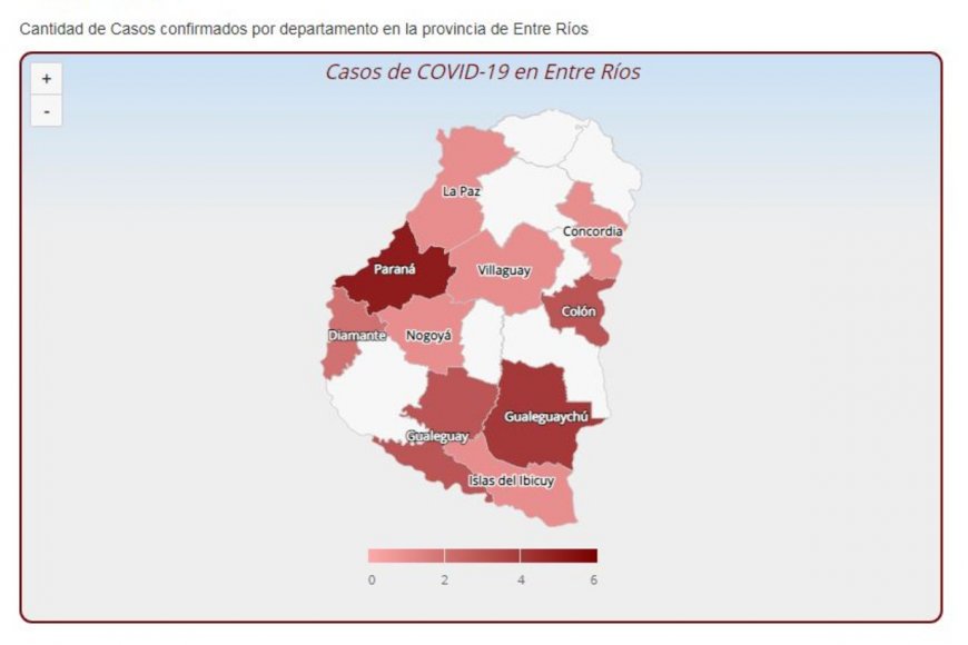 El mapa de calor va de 0 a 6, o de blanco a rojo intenso. Hay 7 departamentos sin casos, o sea en blanco. Ellos son: Feliciano, Federal, Federación, San Salvador, Concepción del Uruguay, Tala y Victoria. En el lote de los que sí tuvieron algún caso positivo de COVID-19 se destaca Paraná que ya reportó 5 y luego le siguen: Gualeguaychú con 4 casos; y Colón y Gualeguay, ambos con 3.