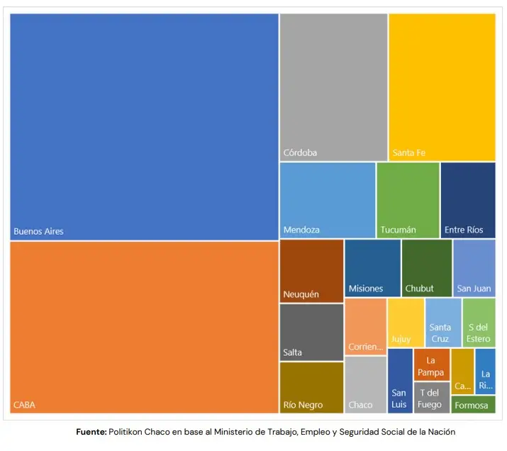 En valores absolutos, los grandes distritos (Buenos Aires, CABA, Córdoba y Santa Fe) explicaron el 69 por ciento de los empleos creados en el último año, situación dada por su alta participación en el mercado laboral formal, aunque en términos relativos su suba es menor a otros distritos.