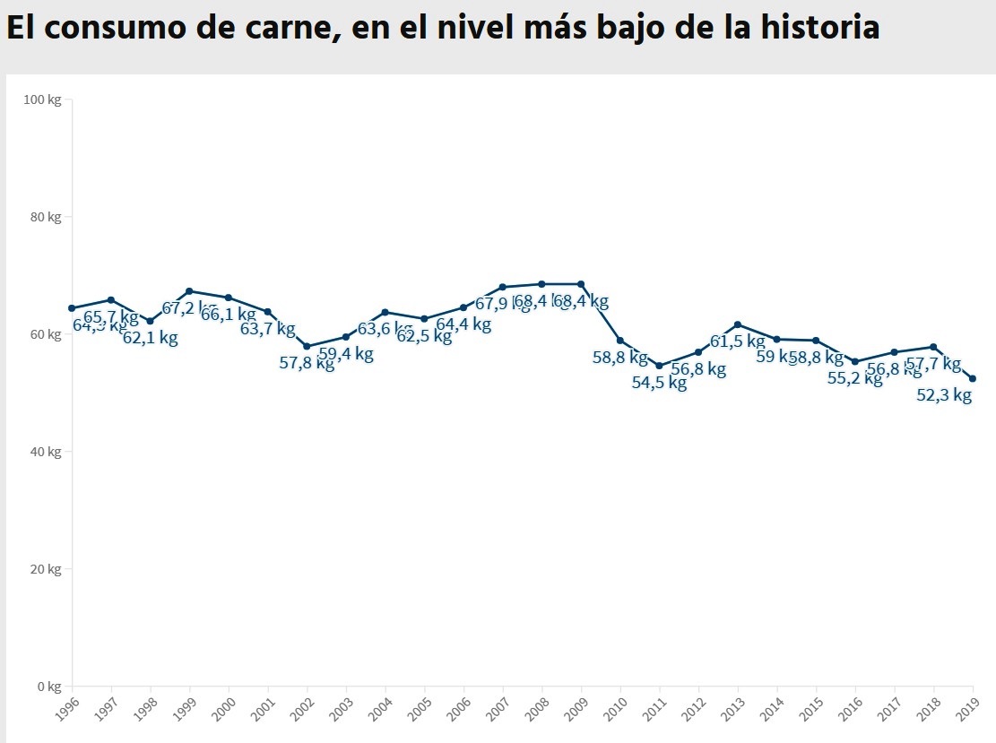 De acuerdo a la estadísticas del Instituto de Promoción de la Carne Vacuna Argentina (IPCVA), en últimos diez años el consumo descendió en 18 kilos, tomando como base los 68,7 kilos que los argentinos y argentinas consumían en 2009. Pero ¿por qué? Esta cifra se explica en parte por el avance de las carnes aviar y porcina, potenciada en los últimos tres años por la pérdida del poder adquisitivo del salario.