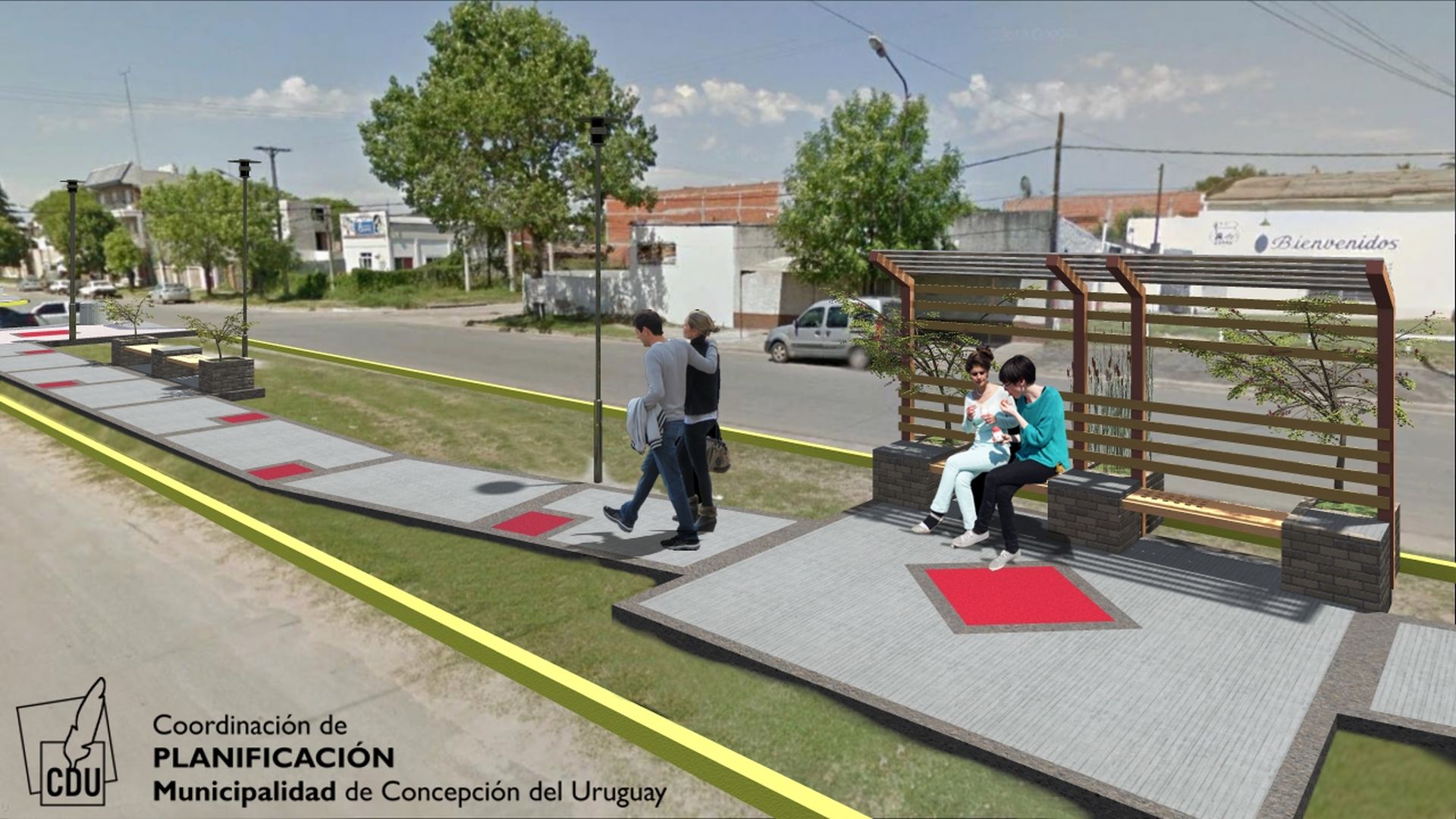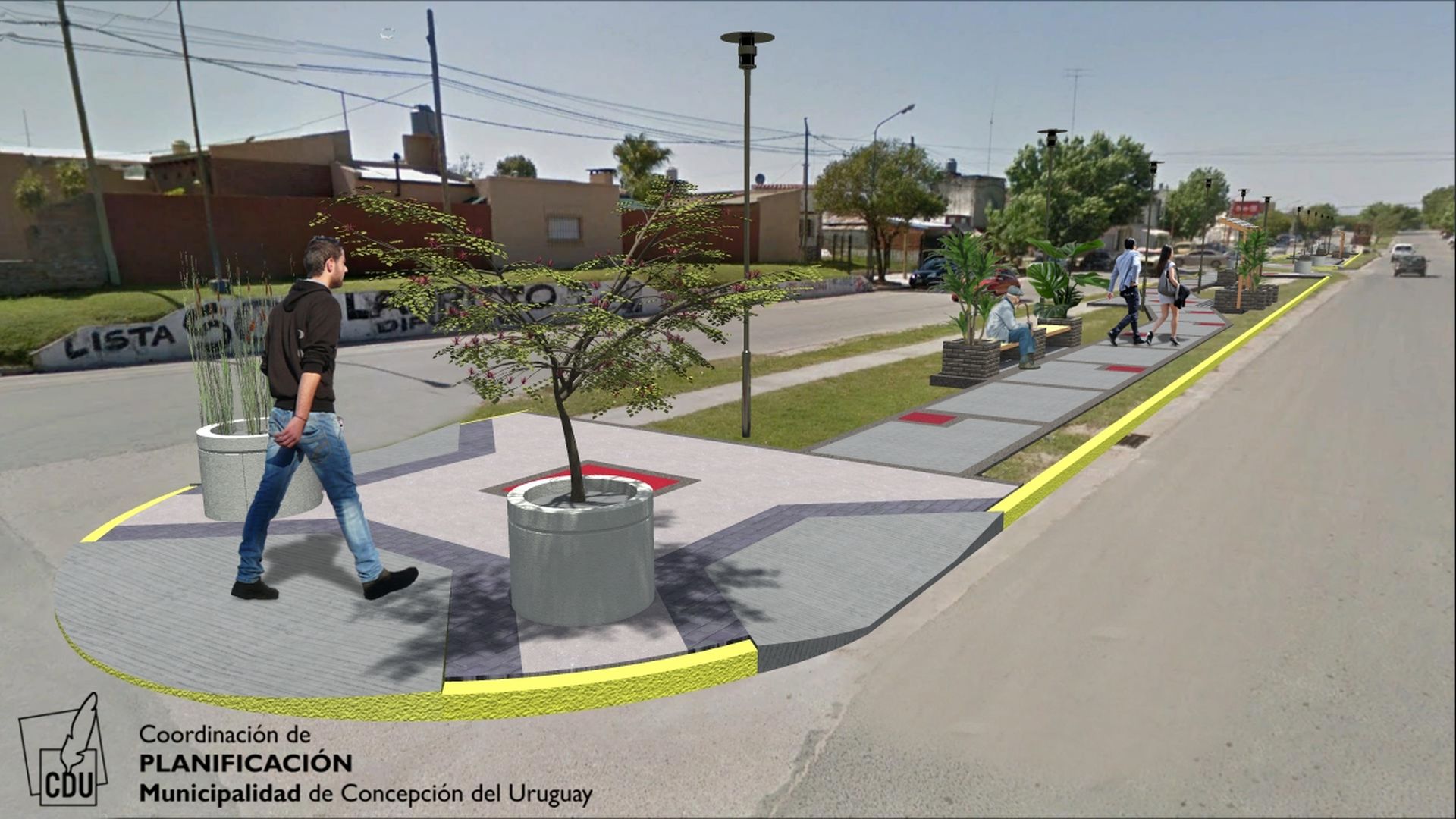 Se propone, en una primera etapa, mejorar el uso de las plazoletas con la construcción de una nueva vereda de dos metros de ancho sobre cuatro cuadras del Boulevard Montoneras – desde calle 9 de Julio hasta Almafuerte – para concentrar la circulación peatonal y así garantizar la conectividad y la seguridad del peatón.