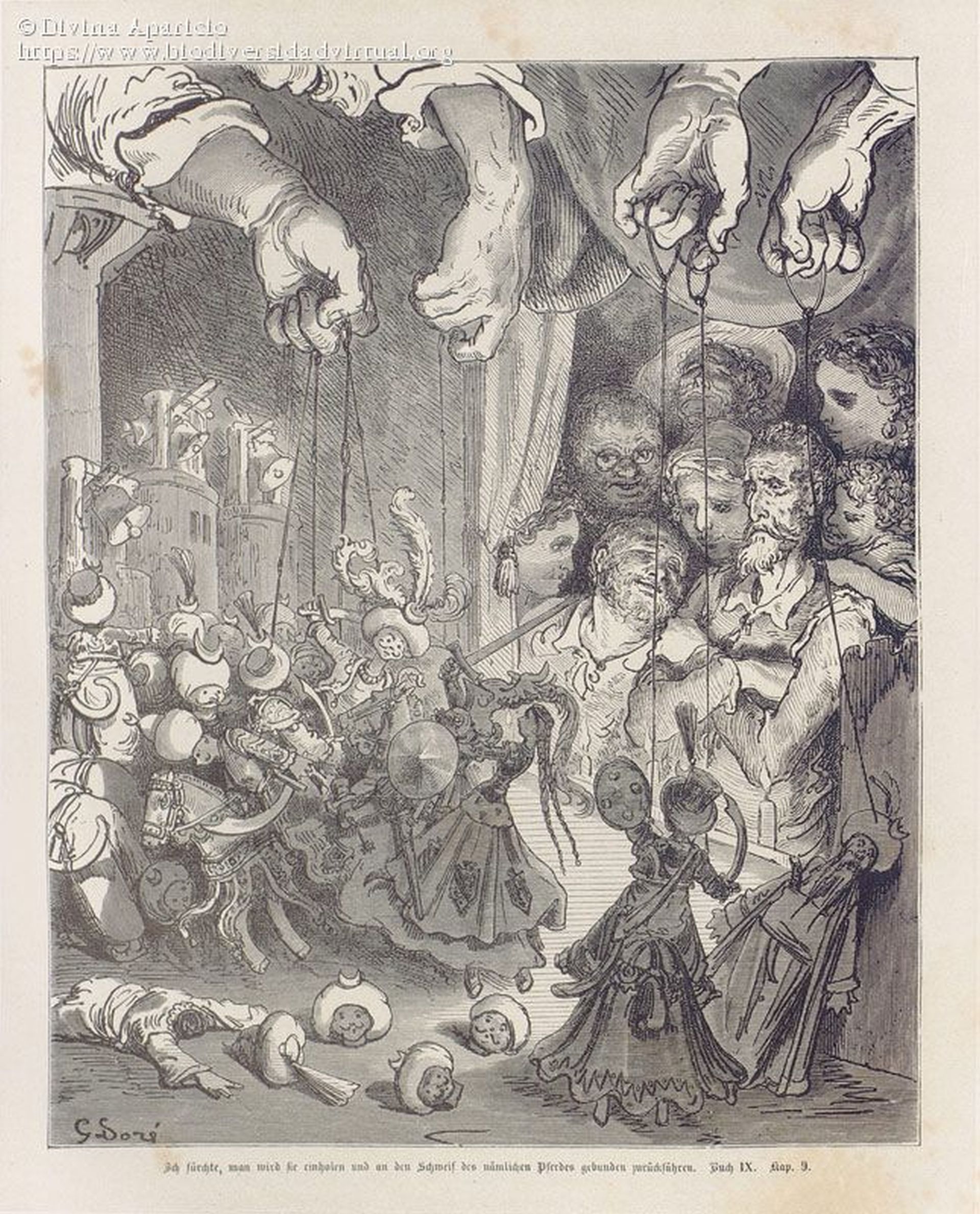 Mientras ve una representación teatral con títeres, Don Quijote –en medio de una alucinación- pasa de espectador a actor y decide defender a la protagonista -una princesa de madera y trapo- descabezando con su espada a todos los otros muñecos.