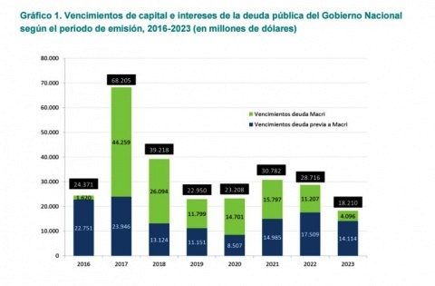 Siempre según el informe, que lleva la firma de Eva Sacco, consigna que de esos 68.205 millones de dólares de vencimientos, 23.946 millones “correspondían a deuda emitida en forma previa a diciembre de 2015, en tanto que 44.259 millones de dólares (64,9% del total) a deuda emitida durante la administración Cambiemos”.