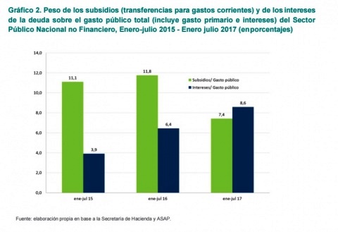 Un estudio de la consultora Analogías revela que el pago de intereses de deuda insumió en el primer semestre de 2017 el 8.6 por ciento del gasto público, y se situó por encima de lo que se destina a subsidios.