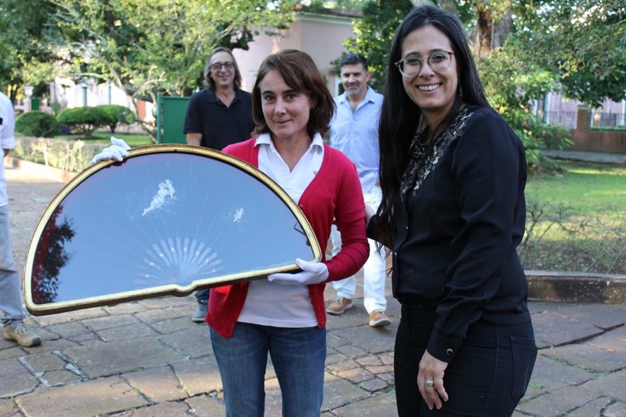 Nélida Impini, integrante del Área de Conservación junto con Guillermina Bevacqua, directora del Palacio San José, reciben el abanico perteneciente a Dolores Costa.