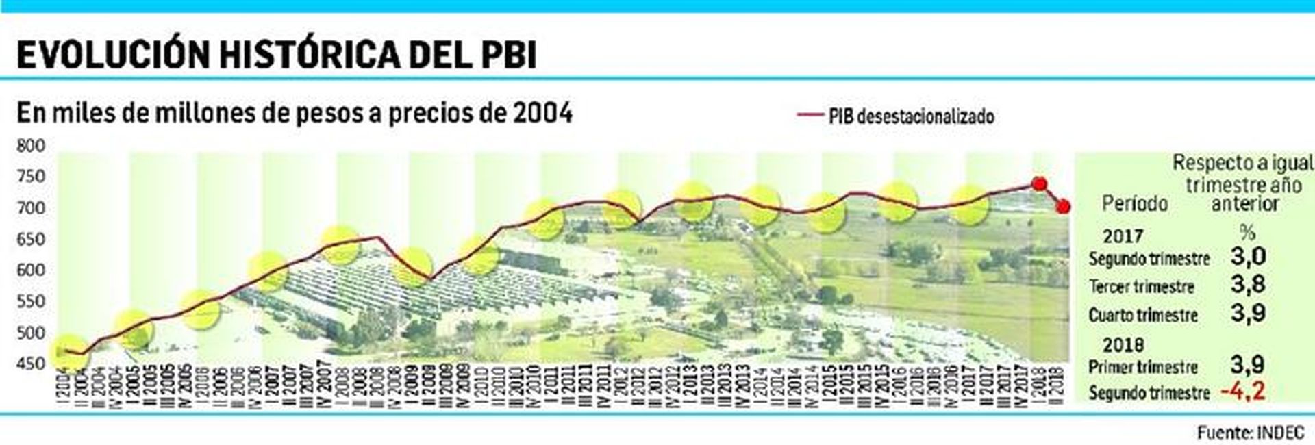 Ahora tras un buen primer trimestre donde el PBI creció 3,9% interanual, el segundo trimestre acusa el inicio de la recesión donde el puntapié inicial lo dio la sequía que afectó al agro y por ende al sector exportador y los demás sectores vinculados como el transporte. Claro que también comenzó a impactar el deterioro de las condiciones financieras internacionales. A partir de ahora, se verá mensualmente el impacto de la devaluación, de la super tasa de interés, de la creciente inflación y del derrumbe del poder adquisitivo de la población con su correlato sobre el consumo doméstico. A esto se suma además el ajuste del gasto público, que por más modesto que sea (dado que todo recae sobre los subsidios económicos -más tarifas- y en menor medida la obra pública) que impactará en el nivel de absorción doméstica. De modo que la dinámica recesiva continuará, seguramente, a lo largo del tercer trimestre. El arrastre estadístico del año ahora está en -1%, es decir, el PBI se contraería un 1% en 2018 si se mantuviera constante en el nivel del segundo trimestre durante el resto del año.