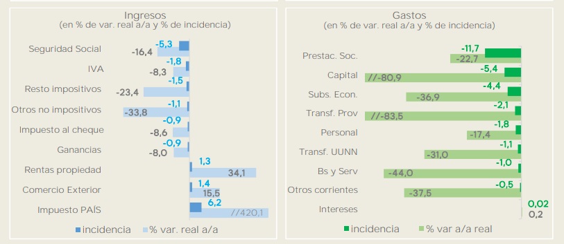 Entre el ajuste de gastos que hubo dentro del Estado, sobresale el recorte de las transferencias a las provincias, las cuales cayeron un 83,5%. Además, los recursos destinados a la Seguridad Social tuvieron una reducción del 16,4%, a causa de la reducción del empleo y la caída del salario real.
