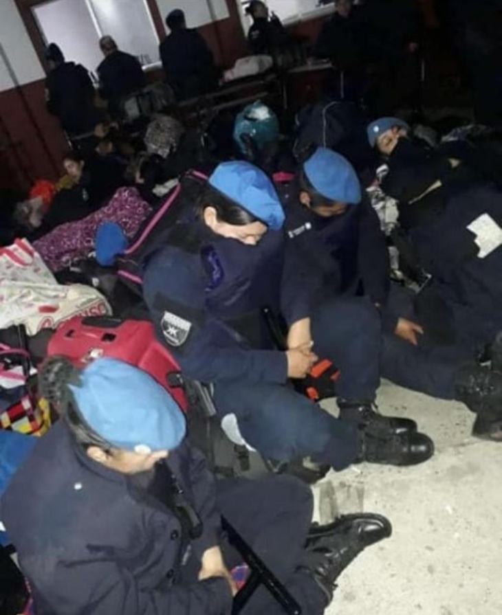 Las 4 mil mujeres policías que llegaron a nuestra ciudad para brindar seguridad en el 34° Encuentro Plurinacional están denunciando en estos momentos por redes sociales y también a través de comunicaciones radiales internas de la fuerza a las que accedió este diario digital de La Plata, que permanecen «hacinadas en cualquier lado, sin comer, sin bebidas» y hasta han dormido «tapadas con cartones y nylon en la Jefatura de Policía de calle 2». Y para acompañar esa denuncia enviaron fotos que llegaron a El Editor Platense y que se muestran más abajo. A raíz de esta situación, en Acassuso los policías resolvieron en acuartelarse «en solidaridad con las compañeras».