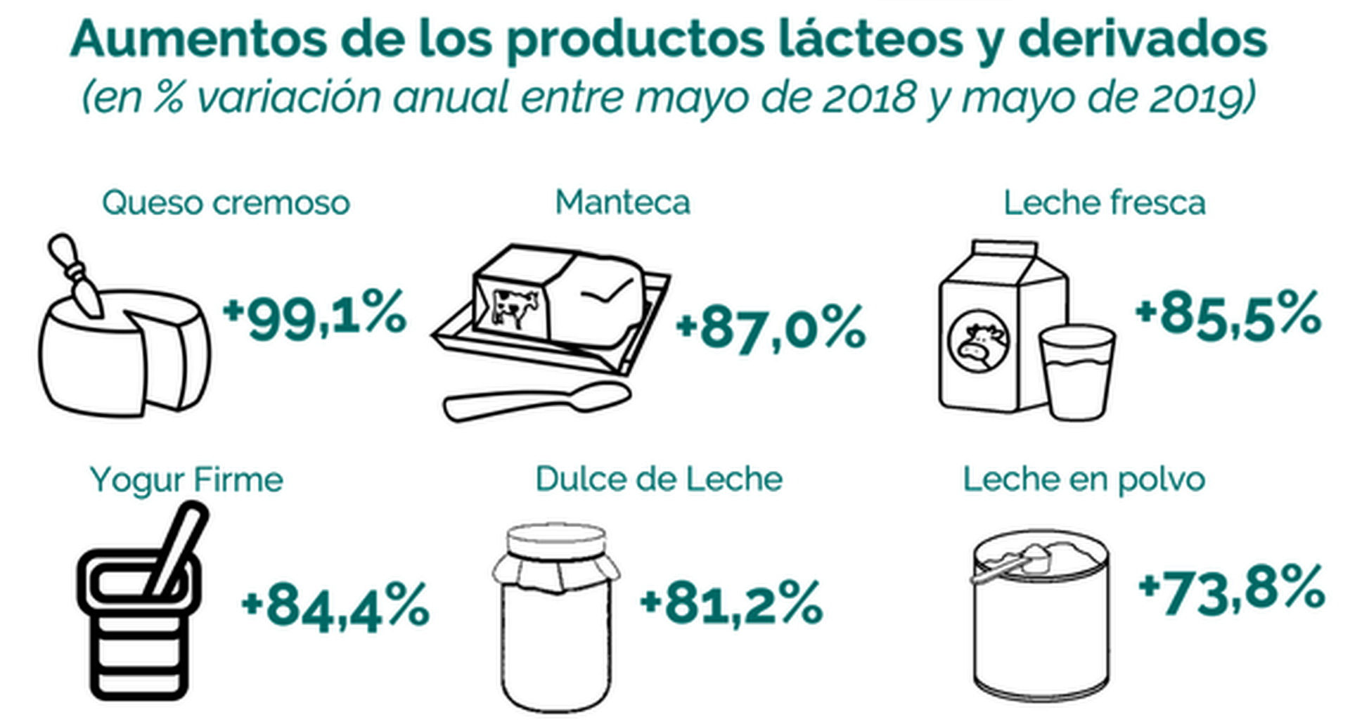 En el detalle, se observa que para el último año hubo subas del 99,1% para el queso cremoso; 87% para la manteca; 85,5% para la leche fresca; del 84,4% para el yogur firme; del 81,2% para el dulce de leche; y del 73,8% para la leche en polvo.