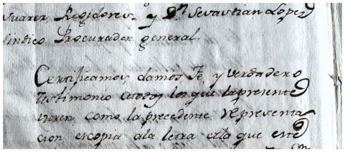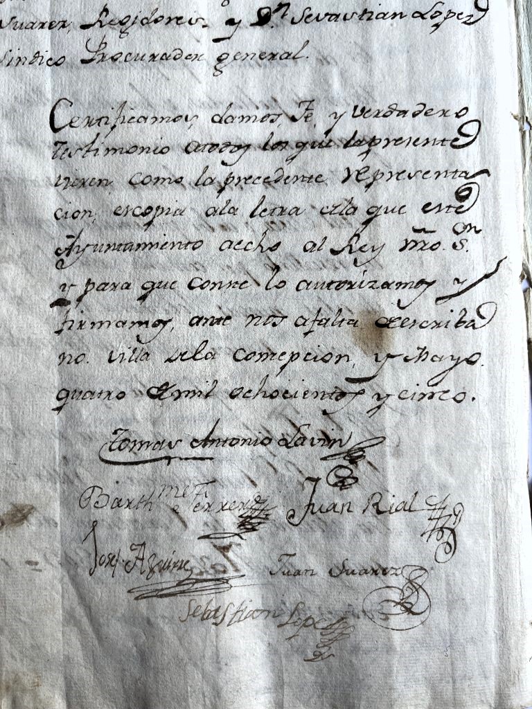 No sabemos quiénes son las plumas reales que plasmaron el documento pero lleva las firmas del alcalde ordinario Tomás Antonio Lavín y los regidores Bartolomé Ferrer, Juan Rial, José Aguirre, Juan Suárez y el síndico procurador Sebastián López.