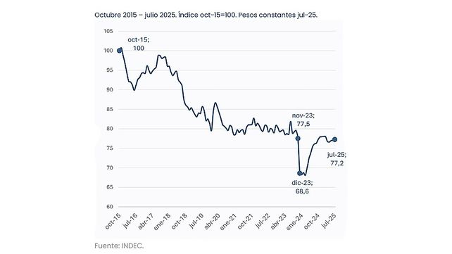 El salario se erige hoy como el termómetro social y el indicador más alarmante del proyecto económico iniciado a fines de 2023. Según diferentes fuentes, entre ese momento y abril de 2025, el poder de compra se redujo en más de un tercio. Otras mediciones, que se extienden hasta agosto de 2025, confirman una contracción real del 32%.