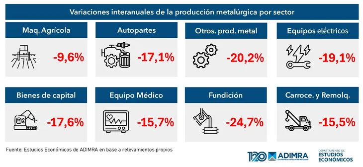 El trabajo indica que hacia el interior de la industria metalúrgica, se observa nuevamente una caída sistémica en todos los subsectores que componen este entramado industrial, bajas que van desde -10% hasta 25%.